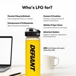 LFG is meticulously designed to ignite inspiration, elevate mood, and enhance cognition, propelling you toward positive thoughts, actions, and a Defiant mindset.